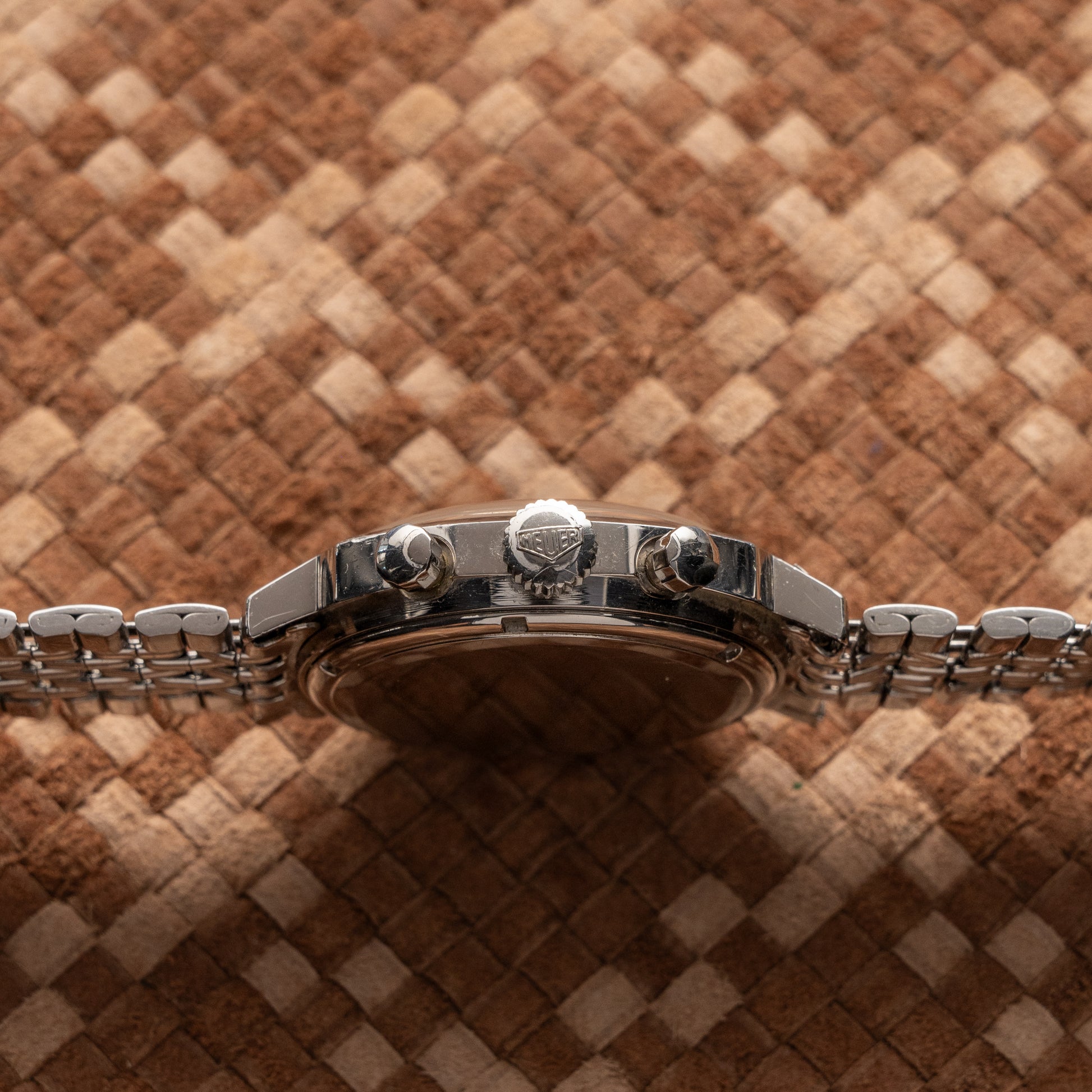 The Heuer Camaro Chronograph Champion reference 7743 is one of the rarest and most sought-after versions of the Camaro line produced in the late 1960s. This Champion variant is distinguished by its special dial, manufactured in limited numbers and primarily intended for the North American market. The stainless steel tonneau case gives the watch a bold and sporty presence while maintaining elegant proportions. It is powered by the manually wound Valjoux 7730, a movement renowned for its reliability and robustness. The presence of the original Heuer bracelet further enhances its collectible appeal. A highly desirable vintage chronograph of great character and rarity for Heuer collectors.