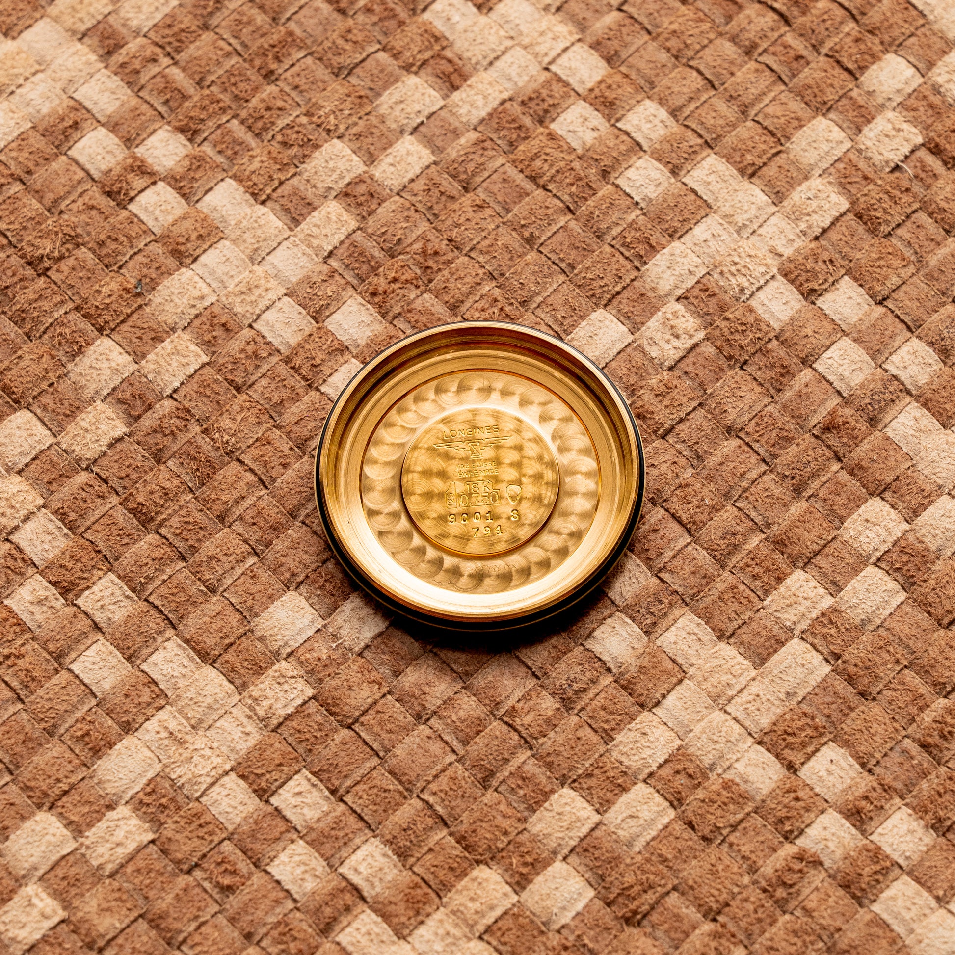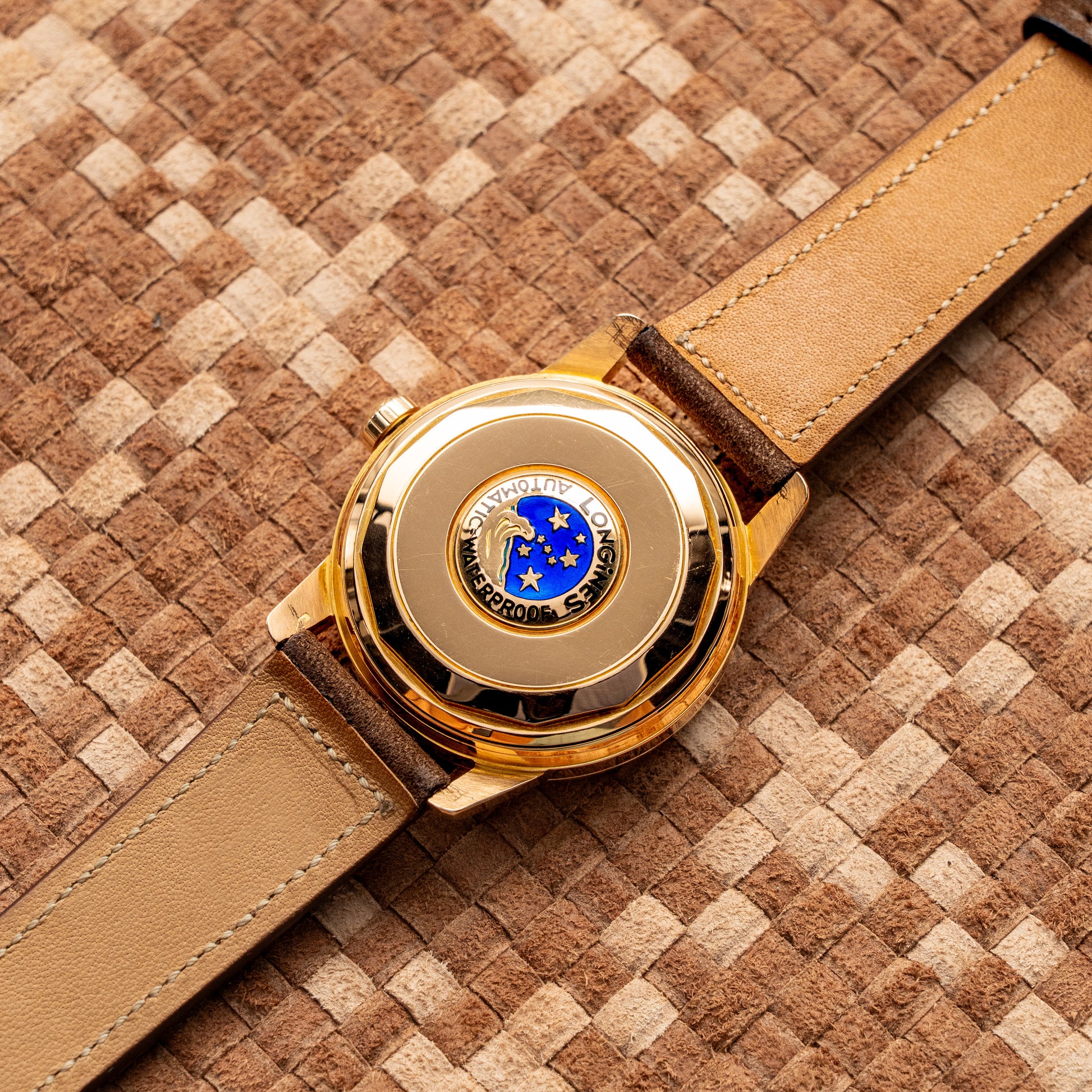 caseback retains its original enamel medallion, an emblematic hallmark of early Conquest models, preserved