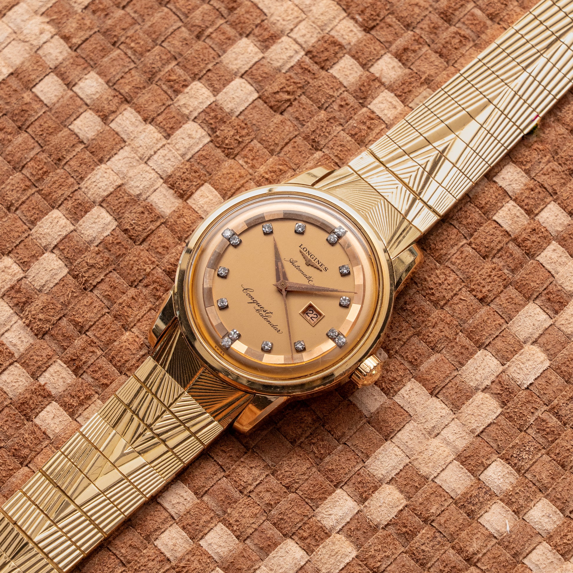 Champagne-gold with 16 diamond hour markers, date at 3 o’clock, “Conquest Calendar” inscription