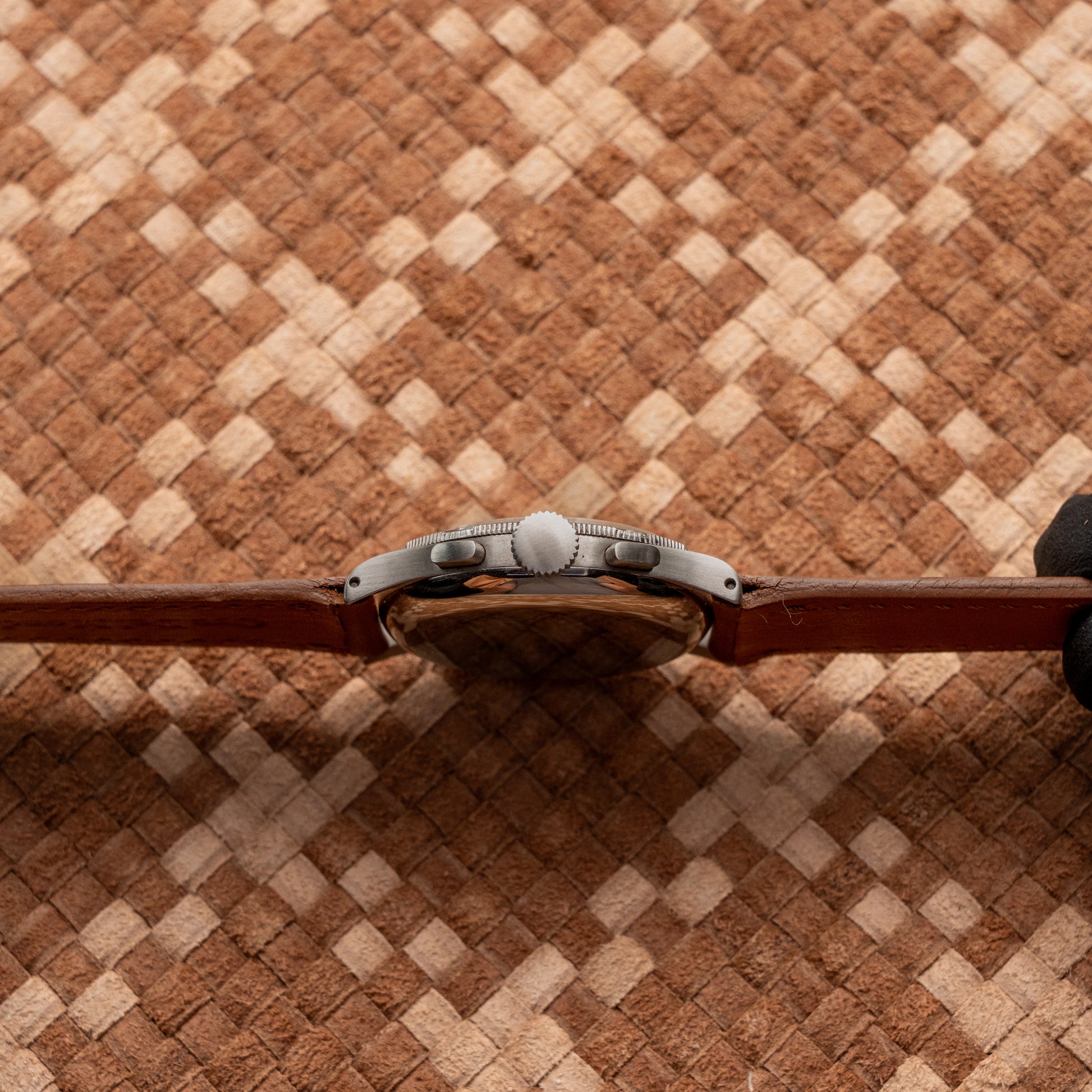 A rare Movado Tempograph Ref. 19006 from the 1940s — one of the most distinctive and technically refined chronographs by the brand. Powered by the renowned caliber 90M, developed with Frédéric Piguet, it features an uncommon chronograph layout: the lower pusher starts and stops the timer, while the upper resets it. The 33 mm stainless steel case remains beautifully preserved, framing a silvered dial with applied Breguet numerals, blue telemeter and tachymeter scales, and original blued hands. Marked “Fab. Suisse” inside the case back, this example was delivered to France and later became part of the prestigious VOGA Antique Museum Collection of Japanese collector Toshio Masui. A charming and historically significant chronograph, rarely found in such exceptional condition.