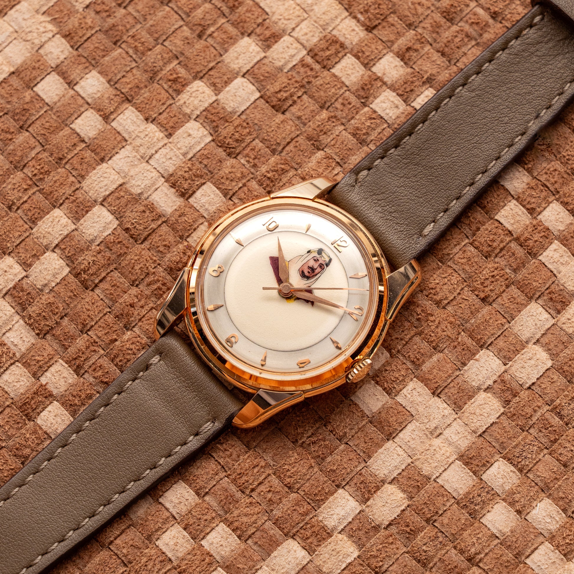 Rare and historically significant, this Longines King Saud Ref. 6615 is a remarkable timepiece produced in the late 1950s for the Royal House of Saudi Arabia. Its silver sunburst dial, featuring gold wedge indexes and dauphine hands, is highlighted by the portrait of King Saud bin Abdulaziz al-Saud, printed above the Longines logo. This special version was commissioned by the King himself as an official diplomatic gift. The 14K yellow gold case is finely crafted, displaying harmonious proportions and preserving all original Longines engravings inside and out. Inside beats the Longines Calibre 23Z, a manual-wind movement renowned for its precision and reliability — a perfect example of the brand’s postwar craftsmanship. Completed with a brown leather strap and gold buckle, the watch exudes understated elegance and timeless balance. This Longines King Saud is a rare fusion of Swiss horological excellence and Middle Eastern royal history — an exceptional collector’s piece seldom seen on the international market. Authentic, unrestored example, with original dial exhibiting light vintage patina, and a serviced, fully functional movement. Extremely rare commemorative model, highly sought after by collectors worldwide.