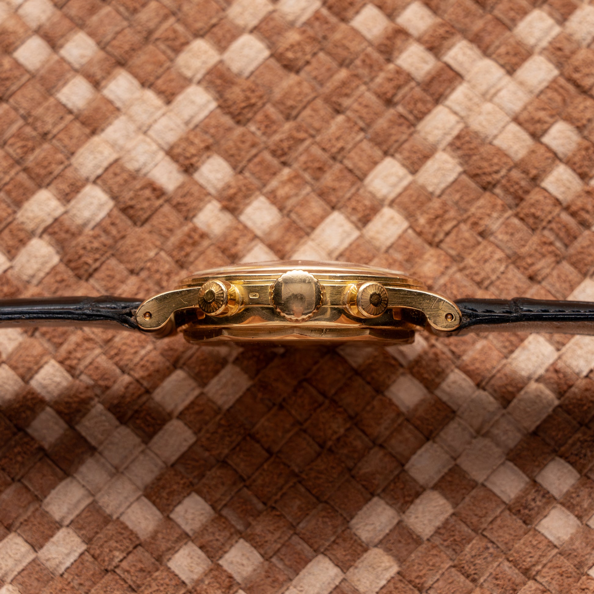 An exceptional and historically significant Patek Philippe Ref. 1463 “for Beyer”, crafted in 1952 and retailed in 1954 by the renowned Zurich-based distributor Beyer Chronometrie. Introduced in 1940, the reference 1463 holds the distinction of being Patek Philippe’s first water-resistant chronograph, featuring a screw-down case back and round pushers designed by the master case maker Taubert & Fils. Produced in fewer than 750 examples across yellow gold, pink gold, and steel, the 1463 remains one of the most coveted vintage chronographs among collectors. The present example belongs to the second series (circa 1945–1961) and stands apart for its unique dial layout, lacking the traditional tachymeter and “chemin de fer” minute track, emphasizing clarity and elegance. The silvered dial displays radium-filled hands and indexes, an exceptionally rare feature among 1463s, and bears the double signature “Patek Philippe / Beyer”, reflecting one of the longest-standing partnerships in Swiss watchmaking history. Powered by the celebrated caliber 13-130, a manual-winding chronograph movement renowned for its precision and architecture, this watch also bears the “FB” hallmark and “Vacuum” engraving on the case back, testifying to its waterproof design.