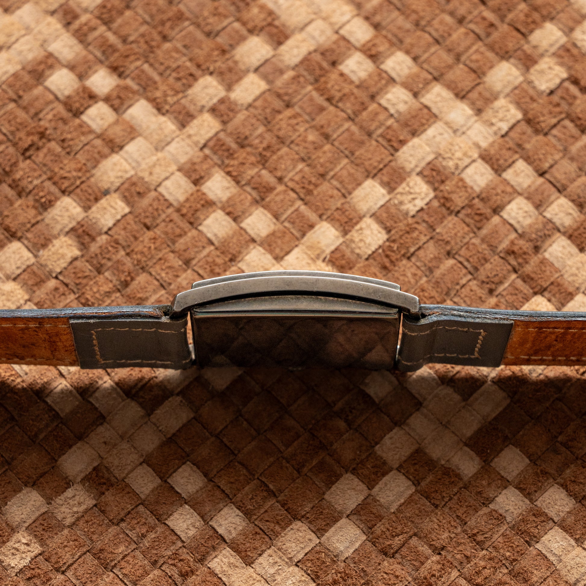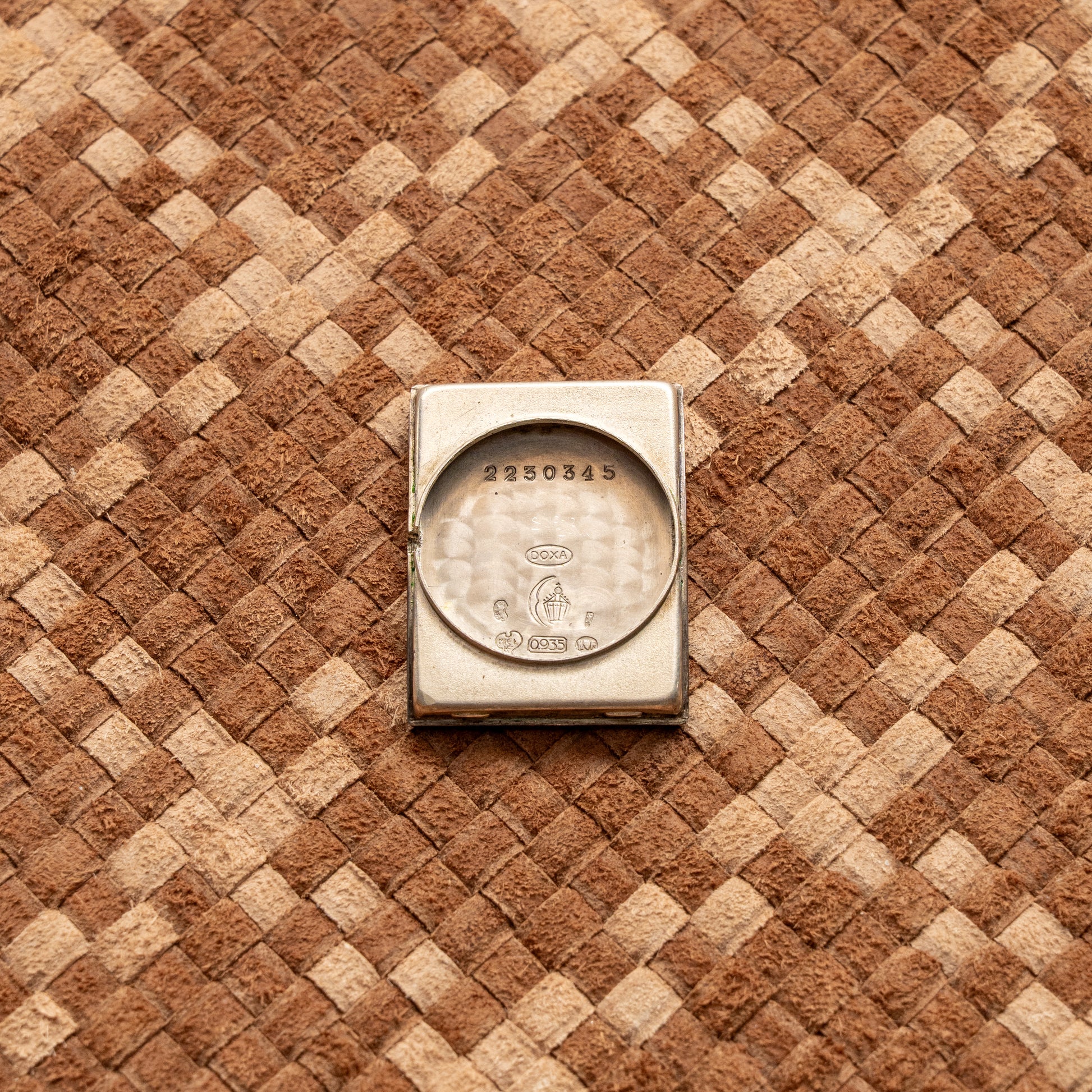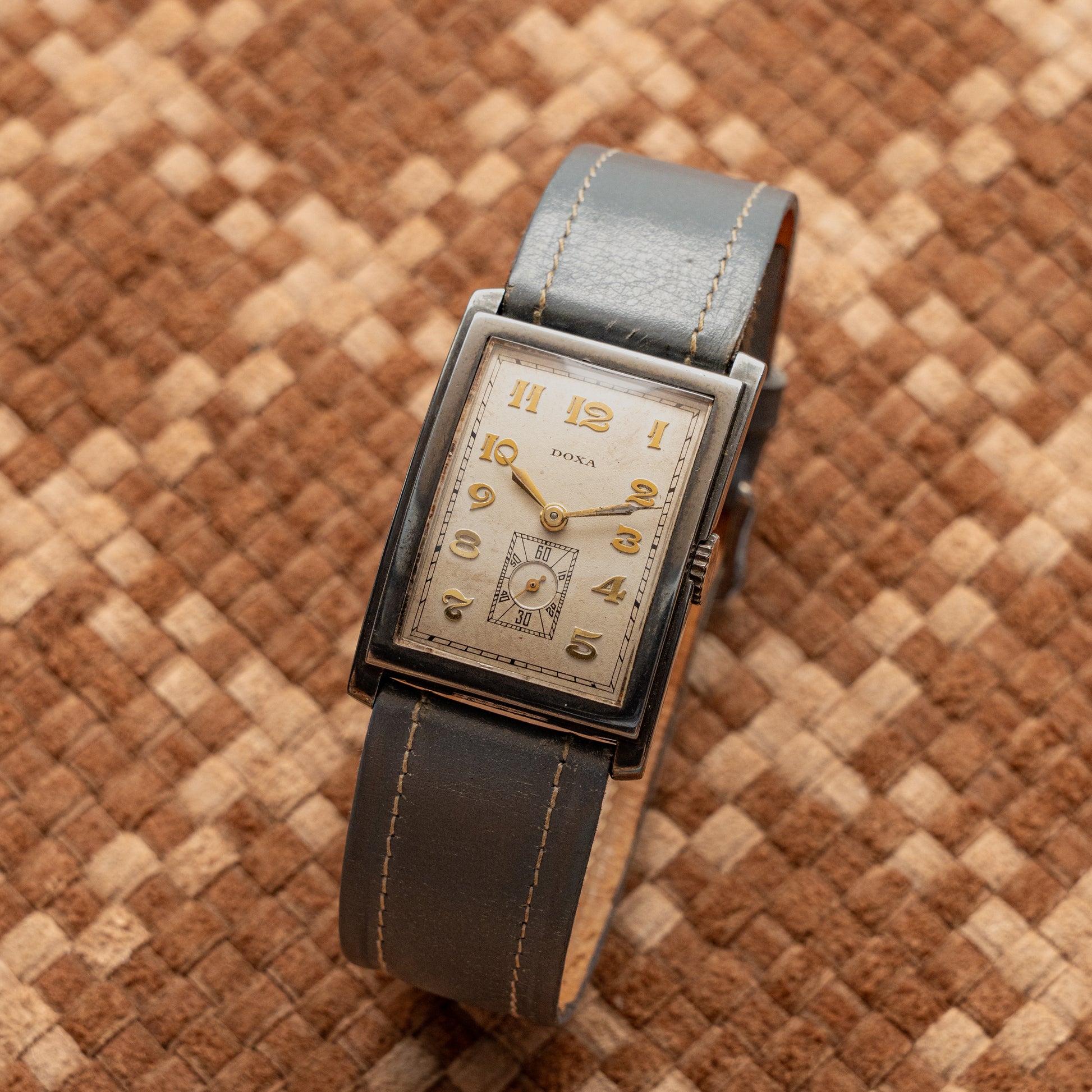 This 1930s Doxa dress watch represents one of the most sophisticated expressions of the brand during its golden age. Founded by Georges Ducommun in 1889, Doxa reached its peak in the 1930s, famously supplying exquisite dashboard clocks for the legendary Ettore Bugatti automobiles. The watch features a solid 935 silver rectangular case, crafted in two pieces and shaped in the elegant Cintrée style, with gentle curvature and refined proportions. Over time, the silver has developed a charming natural oxidation patina, adding character and historical depth to the piece. The original argenté-grené dial is a masterpiece of 1930s aesthetics: embossed mercury-gilded Breguet numerals, and “Chemin de Fer” tracks for both minutes and seconds, all arranged in a balanced and sophisticated layout typical of Art Deco design. Inside, the watch is powered by a Doxa calibre based on the Fontainemelon FHF movement, celebrated for reliability and fine finishing. Fully original, this example comes with its period-correct strap and original box, an extremely rare survivor from the pre-war era. A superb collectible for enthusiasts of early 20th-century horology and Art Deco design.