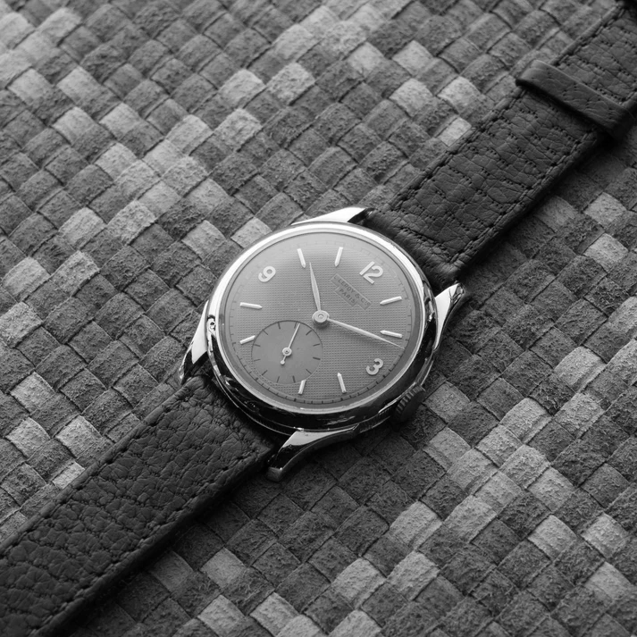 The dial, with its distinctive honeycomb finish, is enhanced by applied gold indexes, Arabic numerals at 12, 3, and 9, and a small seconds subdial at 6 o’clock, offering both harmony and clarity. The manual-winding movement, signed along with the dial, confirms Leroy’s commitment to precision and refinement.