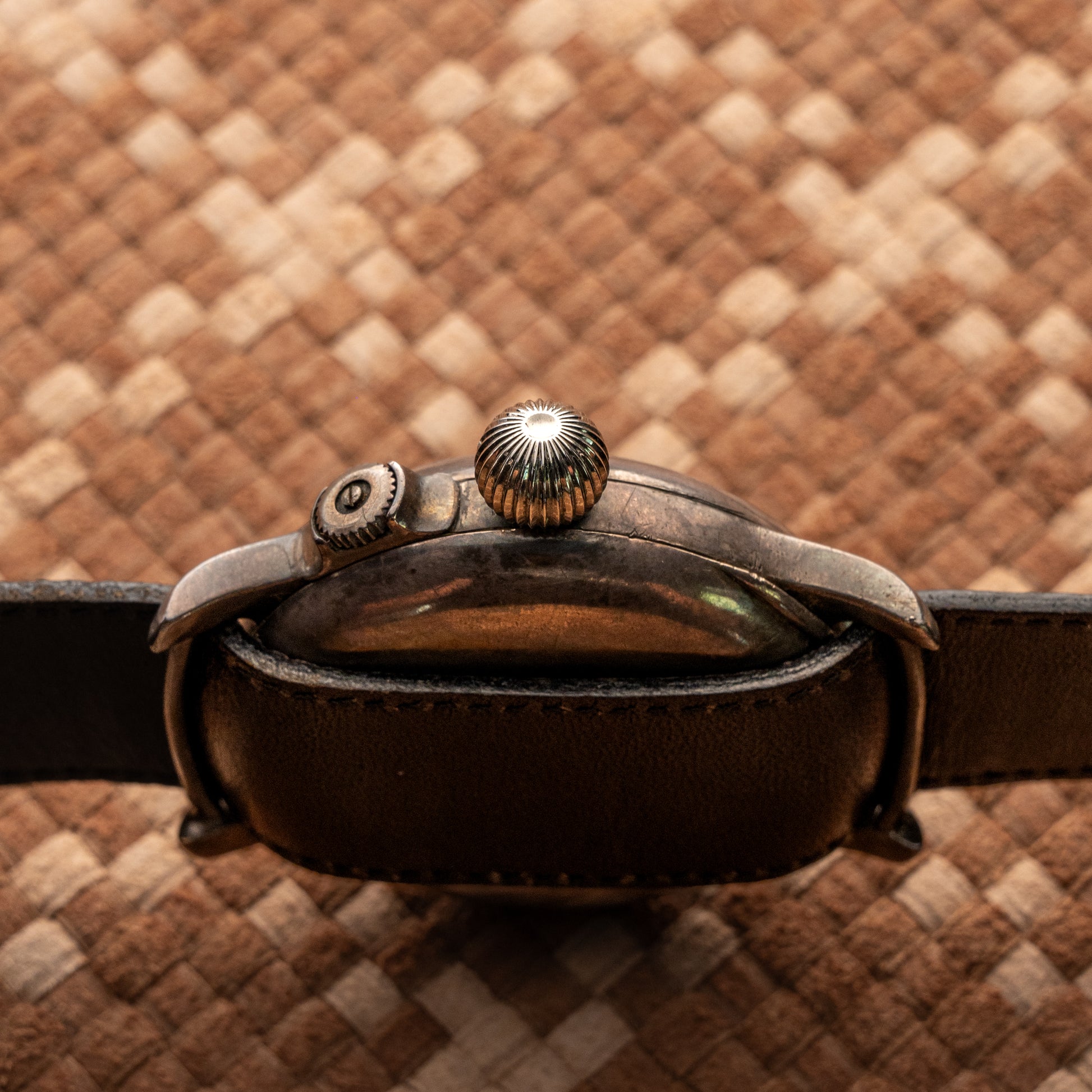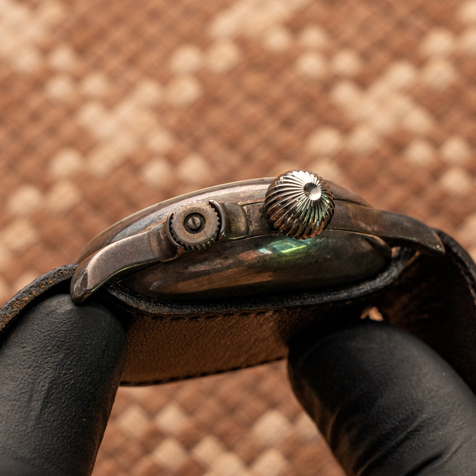 over flight gear. The dial, featuring an adjustable inner disc, displays an even patina that enhances