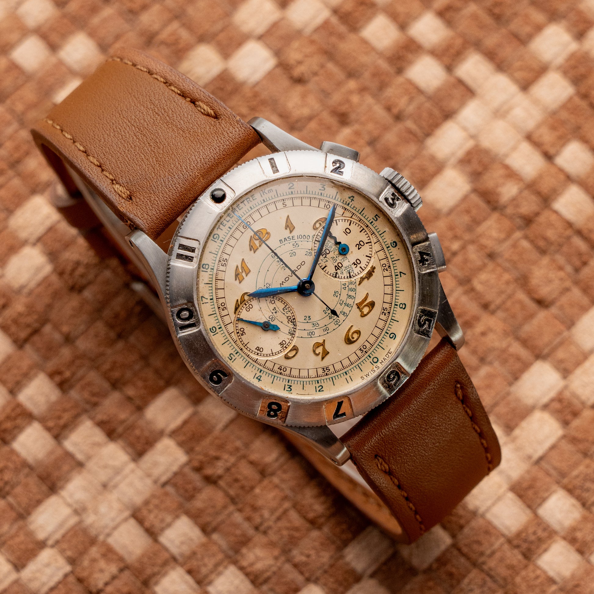 A rare Movado Tempograph Ref. 19006 from the 1940s — one of the most distinctive and technically refined chronographs by the brand. Powered by the renowned caliber 90M, developed with Frédéric Piguet, it features an uncommon chronograph layout: the lower pusher starts and stops the timer, while the upper resets it. The 33 mm stainless steel case remains beautifully preserved, framing a silvered dial with applied Breguet numerals, blue telemeter and tachymeter scales, and original blued hands. Marked “Fab. Suisse” inside the case back, this example was delivered to France and later became part of the prestigious VOGA Antique Museum Collection of Japanese collector Toshio Masui. A charming and historically significant chronograph, rarely found in such exceptional condition.
