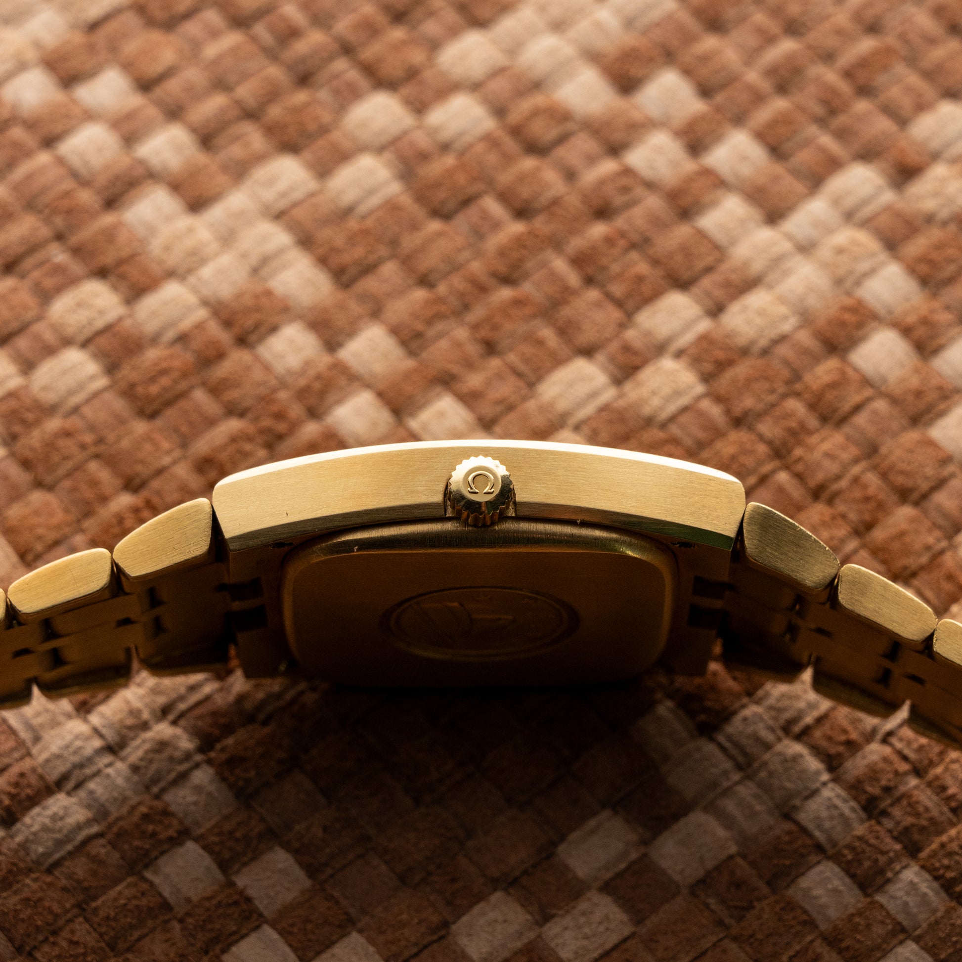 This Omega Constellation ref. BA 368 is an important piece of watch design history, featuring an 18K yellow gold tonneau-shaped case paired with one of the earliest patented integrated bracelets, created by Pierre Moinat in 1964. This architecture established a new design language that would influence later generations of luxury sports watches. The watch is in exceptional condition: unpolished, retaining its full original finishing. The dial is untouched and original, with applied markers and tritium-filled hands. It is powered by the automatic Calibre 1001, offering a 48-hour power reserve and known for reliability. With its plexy crystal, screw-down caseback and date window at 3 o’clock, the watch measures 33 x 39.5 mm with a thickness of 10 mm. The full-gold construction results in a substantial 140-gram weight, adding to its presence and exclusivity. A superbly preserved Constellation, ideal for collectors who value originality and integrated design heritage.