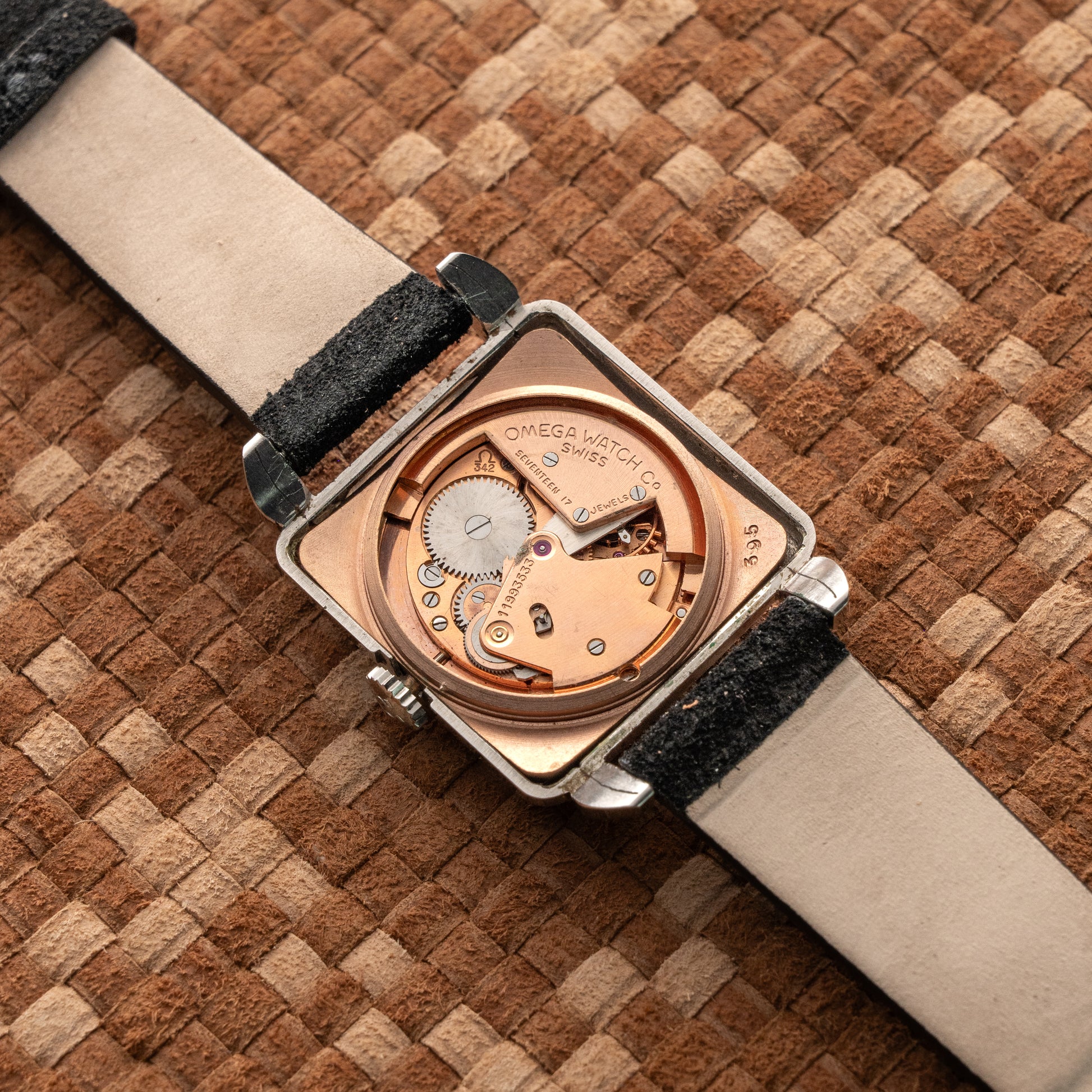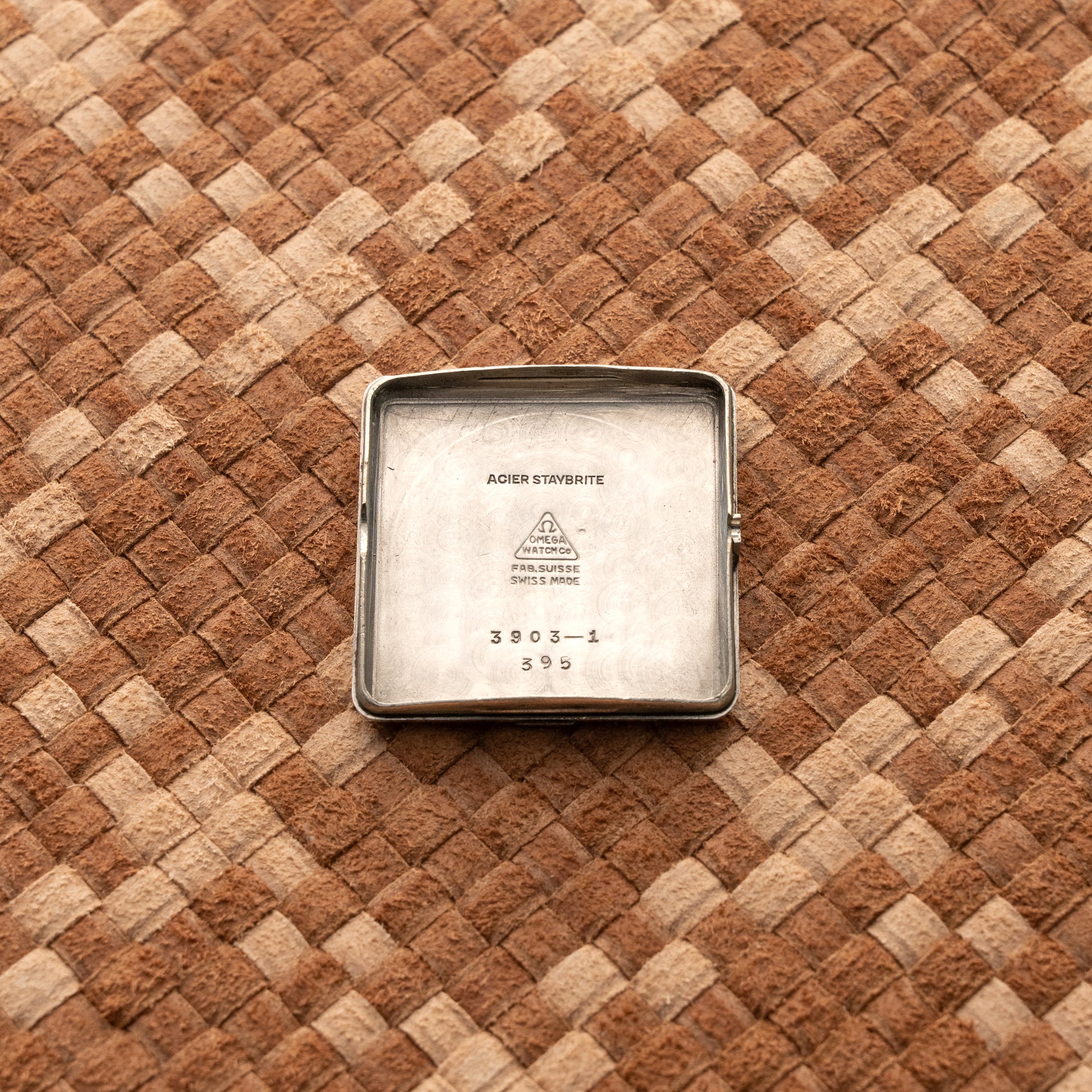 Rare Omega “Cioccolatone” ref. 3903 in stainless steel, dating to the early 1950s. The oversized square “Grand Tank Carré” case gives this piece a bold presence while retaining the timeless elegance typical of Omega’s post-war design. The original white dial displays a pleasant and even vintage patina, featuring applied hour markers and a small seconds sub-dial at 6. The stainless-steel case is in excellent overall condition, unpolished and with sharp edges preserved. Powered by the Omega bumper automatic calibre 342, running well and keeping proper time. The watch is fitted with a new suede leather strap and comes with its original Omega stainless steel buckle, a highly desirable feature for collectors. A refined and collectible vintage Omega, increasingly hard to find in such original and well-preserved condition. Perfect for enthusiasts looking for a distinctive dress watch with character and historical appeal.