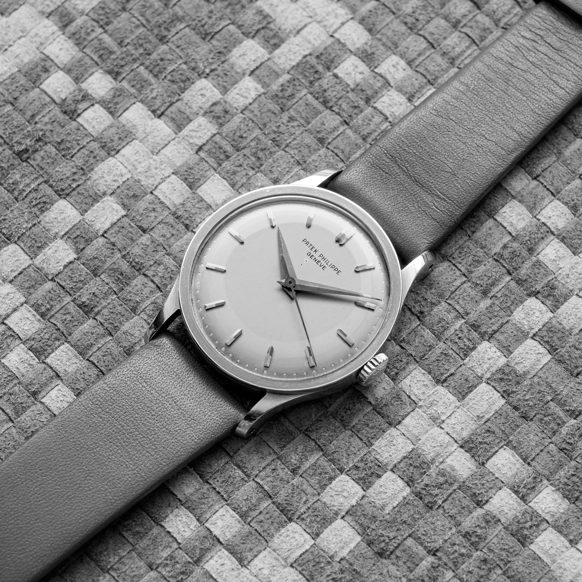 The Patek Philippe Calatrava Ref. 570 stands as one of the most iconic and refined designs ever produced by the maison. Introduced in the 1930s and manufactured through the mid-1950s, it is widely regarded as the purest expression of Calatrava aesthetics. This example is particularly desirable as it is crafted in 18K white gold, a rare and highly collectible configuration. Its 35 mm case, defined by clean lines and balanced proportions, frames an original silver dial with applied indexes and dauphine hands, offering a timeless and understated elegance. Powering the watch is the manual winding calibre 27SC, a beautifully finished and reliable movement considered one of the finest of its era. A rare and distinguished timepiece, this Ref. 570 embodies Patek Philippe’s heritage of purity, craftsmanship and design excellence.