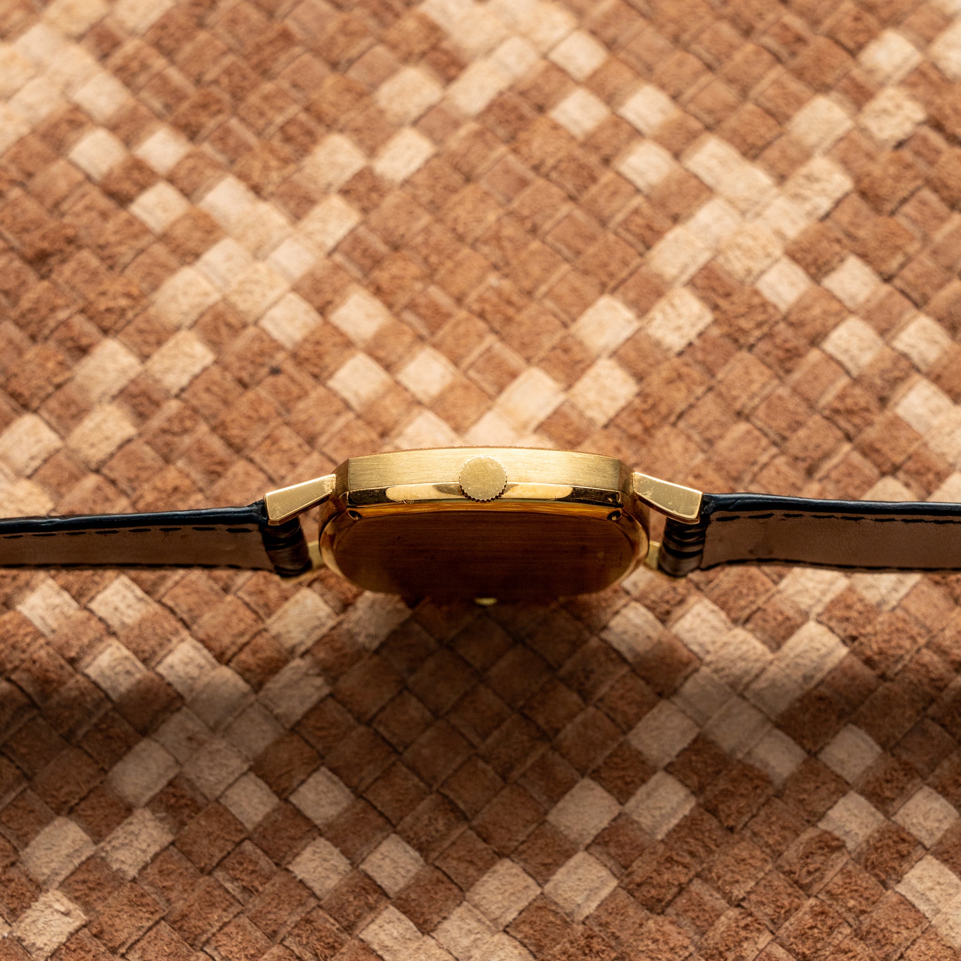 This vintage Piaget reference 612406 dates back to the 1970s and is a distinctive example of the brand’s bold and innovative design language of the era. The 18K yellow gold cushion case features Piaget’s iconic bark finish, applied consistently to both the bezel and the dial, creating a rich and textured visual effect. The dial is configured for dual time display, with two independent sub dials allowing the simultaneous reading of two different time zones. The combination of baton hour markers on one register and Roman numerals on the other adds depth and visual balance to the composition. Powered by a manual winding Piaget movement, this watch embodies the maison’s expertise in elegant complications and precious metal craftsmanship. Fitted with a leather strap and preserved in very good condition, it represents a highly collectible vintage Piaget with strong aesthetic identity and historical appeal.