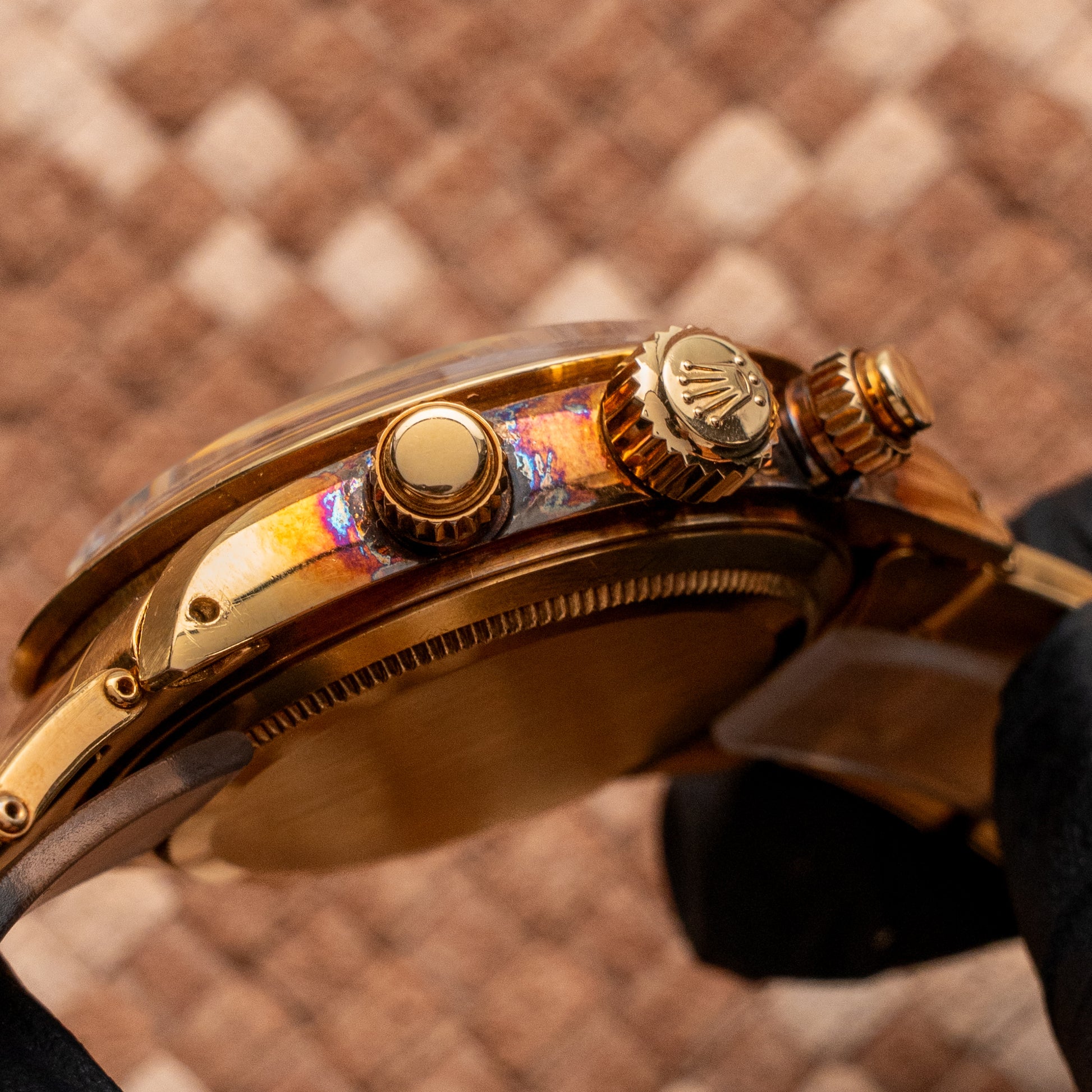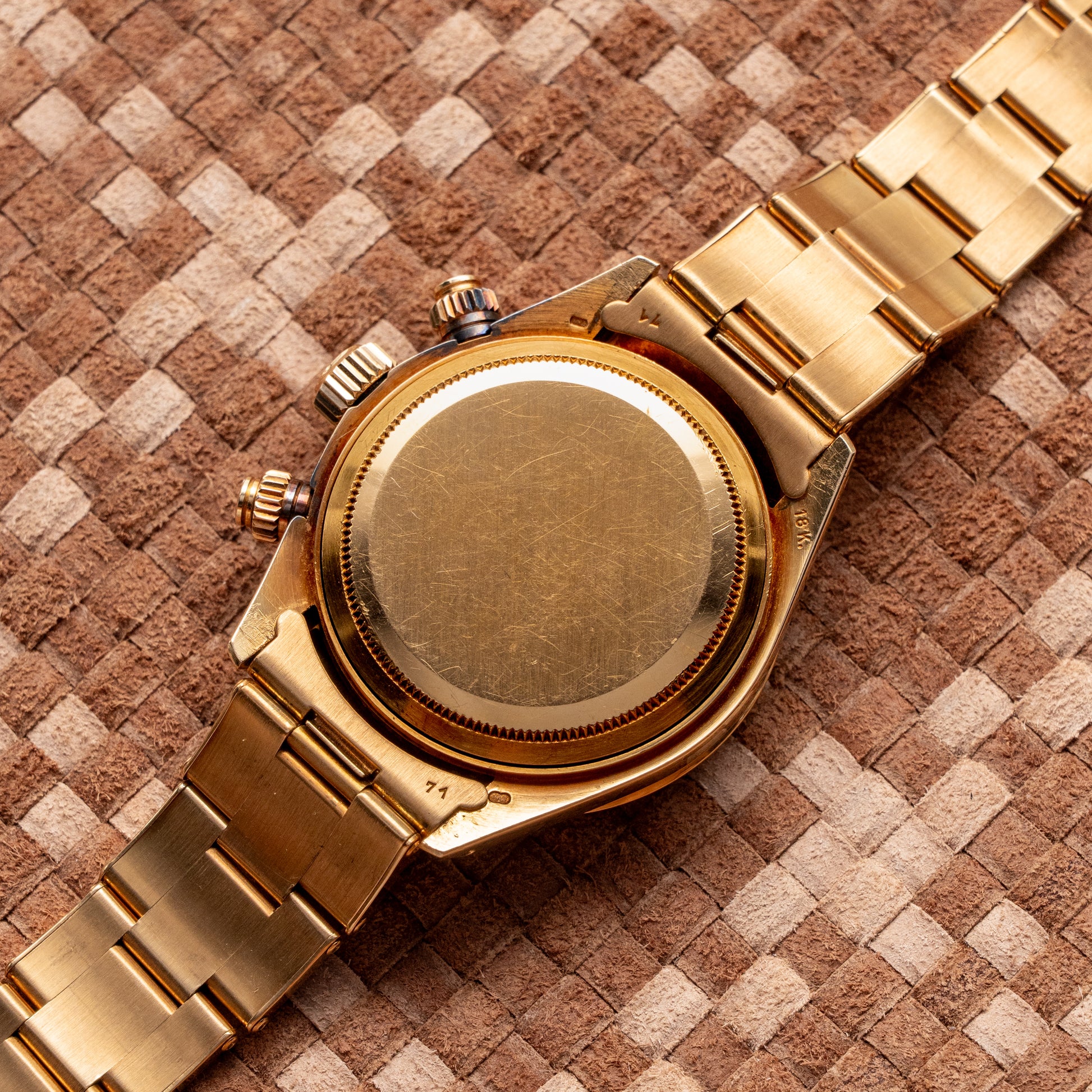 Exceptional Rolex Cosmograph Daytona ref. 6265 in 18k yellow gold, manufactured in 1987 and sold in Italy, complete with its original box and Italian warranty. Belonging to the 9-million serial range, this watch is among the last examples of the manually-wound Daytona models. It features a champagne sunburst dial with black sub-dials, combining sophistication and sporty appeal. The watch is powered by the Rolex Caliber 727, numbered and in outstanding condition, representing the pinnacle of Rolex’s hand-wound chronograph development. The 18k yellow gold Oyster bracelet, fitted with 71 end links and 7205 signed clasp, remains in excellent shape with minimal stretch and original finish. A highly collectible vintage Daytona, offering historical relevance, mechanical refinement, and complete provenance — an exceptional opportunity for discerning collectors.