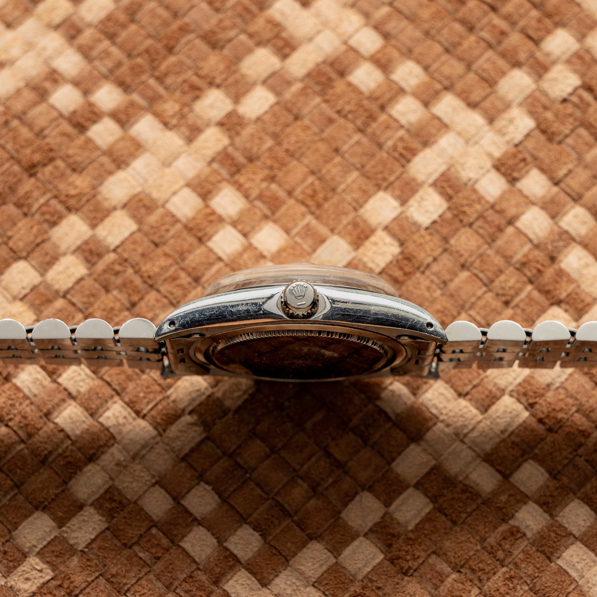 The Rolex Oysterdate Precision Ref. 6694 is one of the most iconic manual-wind models ever produced by the brand, appreciated for its clean design and mechanical charm. Manufactured in the late 1980s, this example features a 34 mm stainless steel case paired with the classic Rolex Jubilee bracelet. The silver dial is exceptionally well preserved, with applied hour markers, dauphine hands, and a date window at 3 o’clock enhanced by the Cyclops lens. Inside, the manual-winding Rolex caliber 1225 beats reliably, a 17-jewel movement celebrated for its durability and precision. A timeless and versatile piece, ideal both as a daily wearer and as a collectible for enthusiasts who value the understated elegance of vintage manual-wind Rolex references. This example stands out for its crisp, untouched condition and original bracelet.