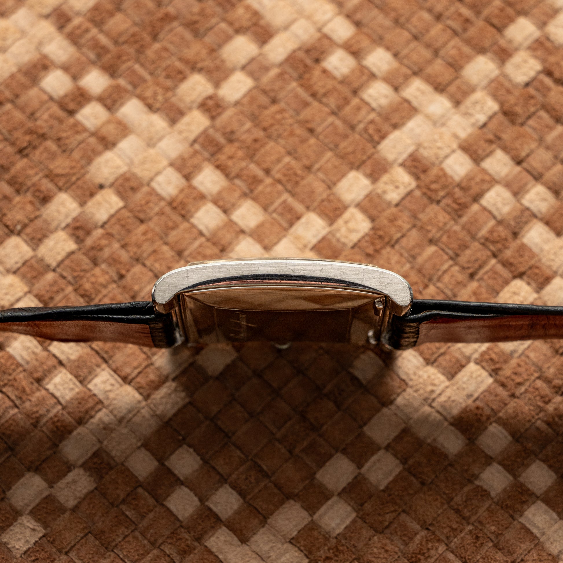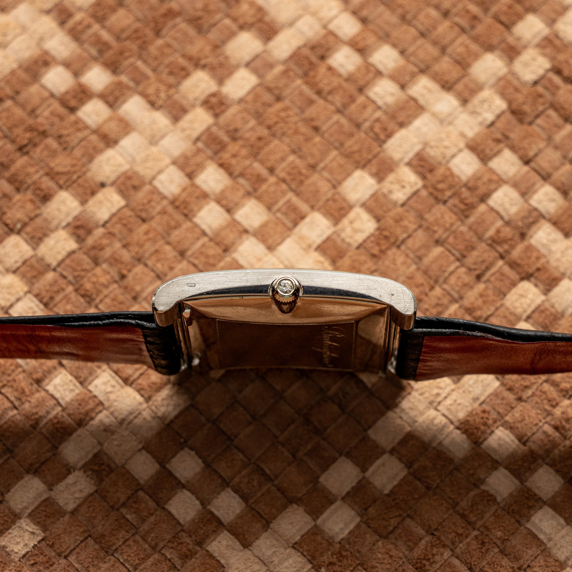 This rare 1980s Corum Buckingham reference 8393 is a refined dress watch that embodies the understated and architectural design language of the Buckingham collection. Crafted in 18K white gold, the rectangular case measures 36 x 39 mm, offering a distinctive yet well-balanced wrist presence. The silver dial features rare diamond-set stick hour markers, an uncommon detail that adds subtle brilliance while preserving a clean and elegant aesthetic. The watch is powered by the reliable AS 4200 manual-winding caliber, known for its robustness and classic Swiss construction. Fitted with a leather strap and original Corum buckle, the watch is preserved in overall great condition, making it an excellent choice for collectors seeking a unique and sophisticated Swiss dress watch from the 1980s.