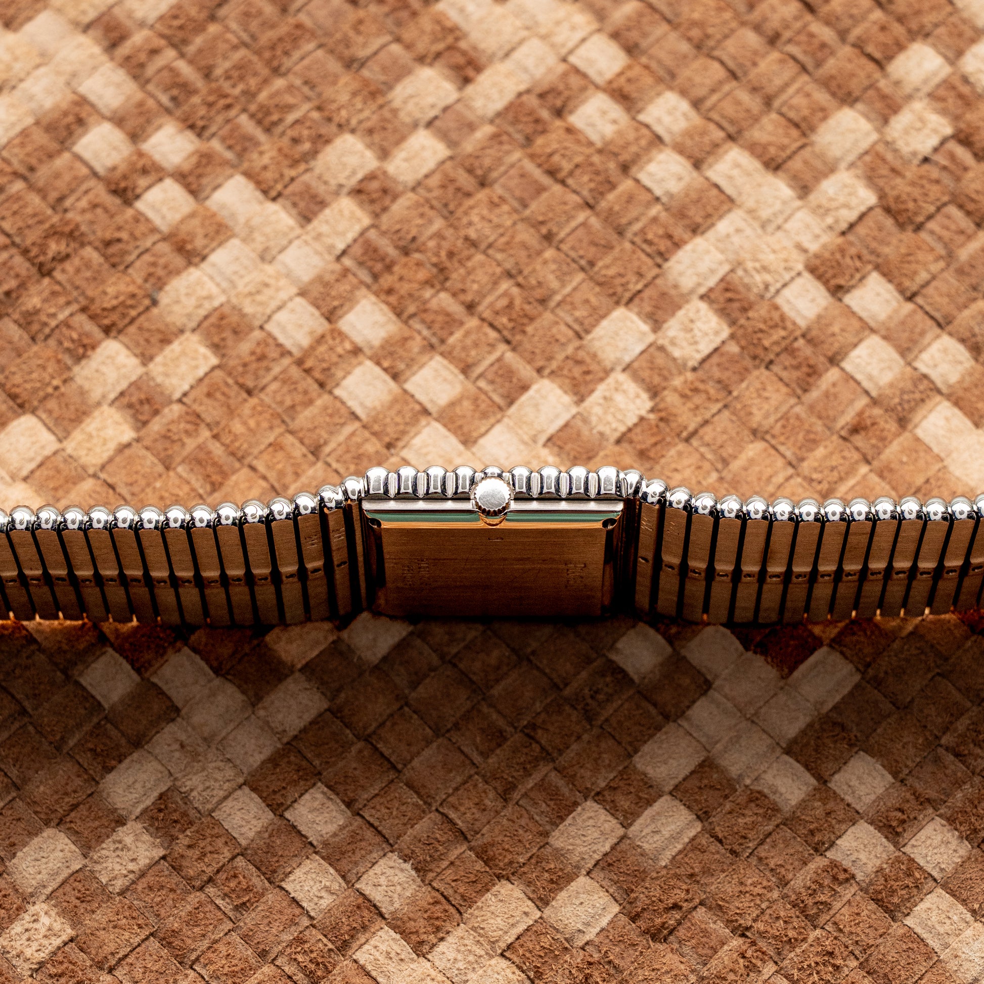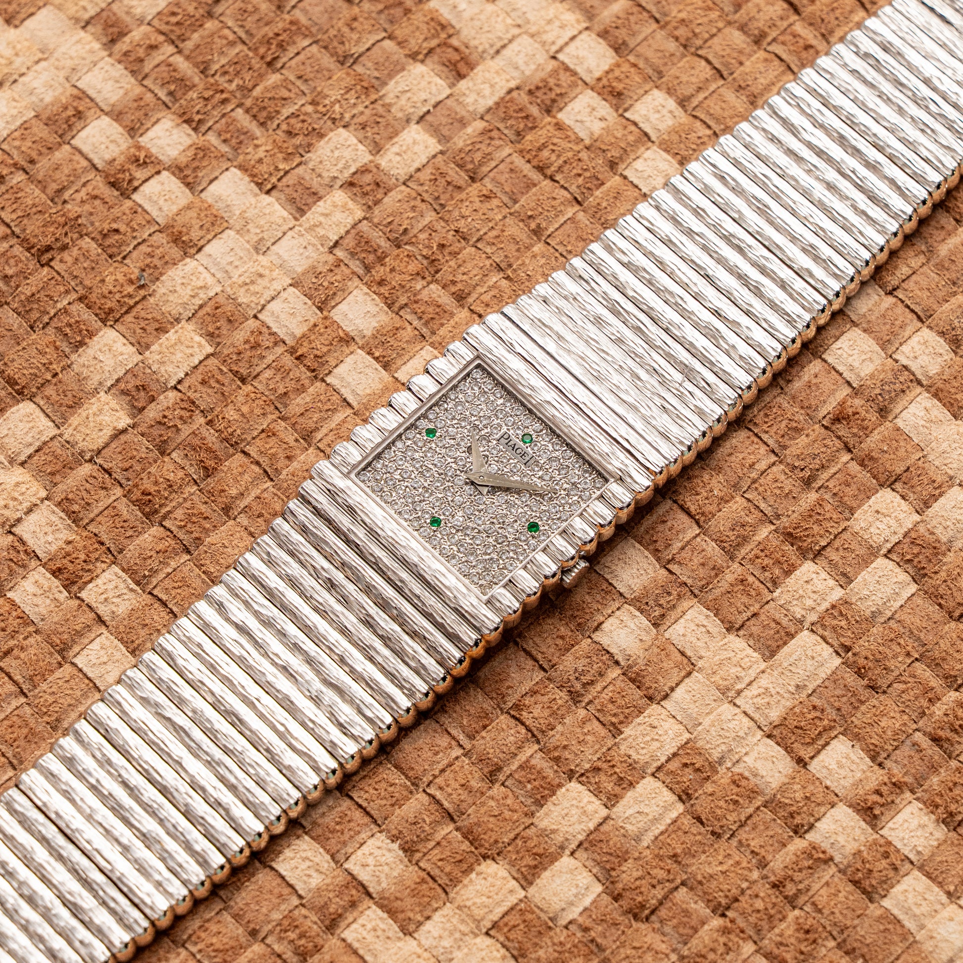 A refined expression of Piaget’s high jewellery watchmaking from the 1980s, this Piaget Emperador Ref. 9131 perfectly embodies the maison’s ability to merge design, craftsmanship and understated luxury. The rectangular 18 kt white gold case is seamlessly integrated into an exceptional hand-carved white gold bracelet, a distinctive Piaget signature. Each link features an irregular, textured finish designed to play with light and enhance the preciousness of the metal, making the bracelet an integral part of the overall aesthetic rather than a simple attachment. The diamond pavé dial provides an elegant, even brilliance, further enhanced by emerald hour markers, a refined chromatic detail that adds depth and character to the composition. White gold hands ensure a clean and balanced readability, consistent with the dial’s minimalist design. Inside, the watch is powered by a manual-winding mechanical movement, slim and reliable, reflecting Piaget’s long-standing expertise in crafting elegant calibres optimized for refined, high-profile timepieces. A highly collectible timepiece that combines high jewellery, artisanal savoir-faire and iconic design, ideal for the discerning collector seeking an authentic and sophisticated Piaget from the 1980s.